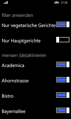 Settings allow selecting canteens and kind of dishes (Windows Phone)